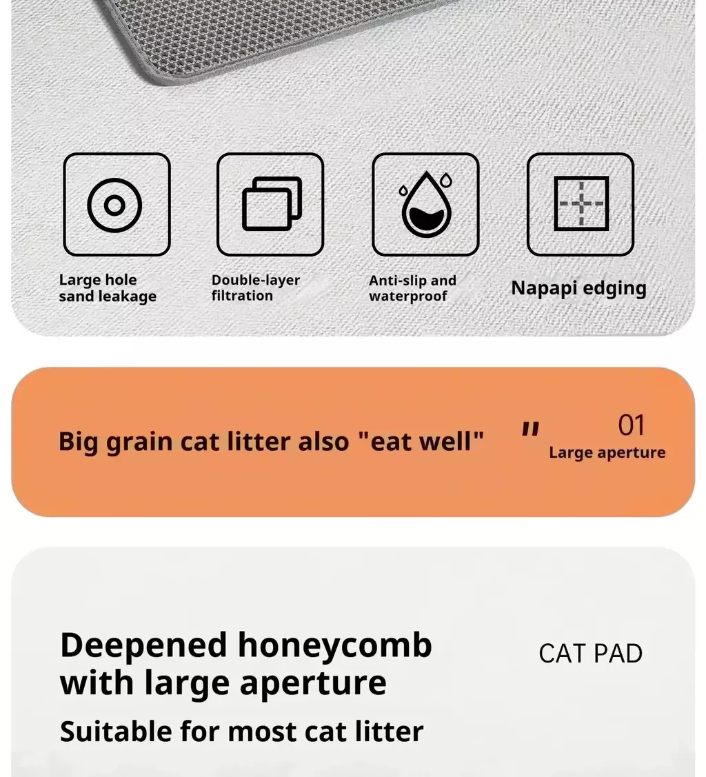A almofada é muito adequada para capturar areia de gato e garras delicadas.Nosso material EVA macio é muito suave para garras de gato sensíveis.Os gatos gostam até de pisar nele ou tirar uma soneca à tarde.O design de camada dupla pode filtrar a areia do gato e colá-la na parte inferior.Agite suavemente para liberar a lixo.